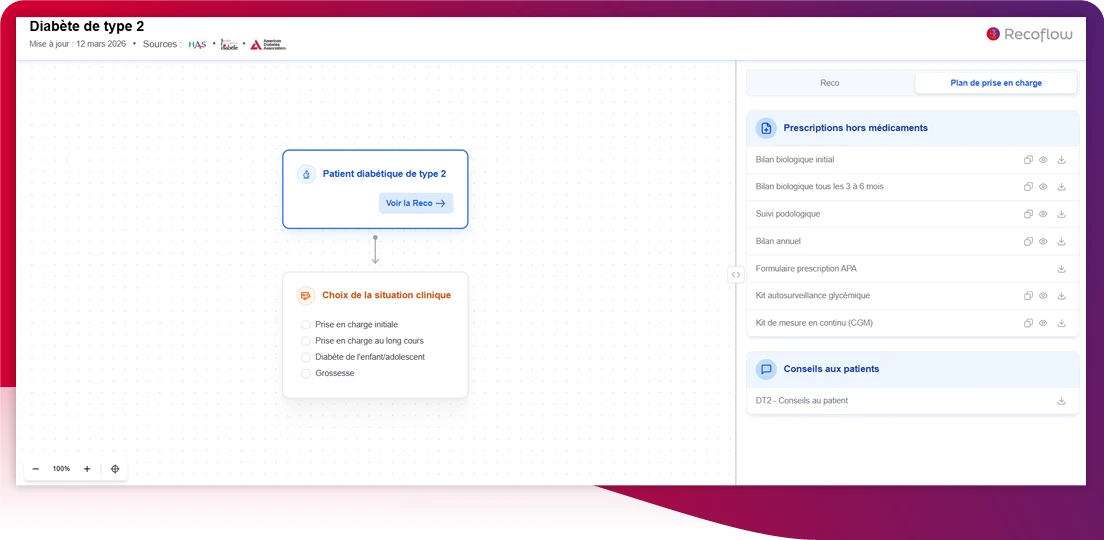 "Un patient est rarement un cas d’école. Face à un patient diabétique, allergique à la metformine et insuffisant rénal, les recommandations officielles ne suffisent pas. Avec Recoflow, je trouve rapidement les options possibles et je peux décider et prescrire sans perdre de temps."